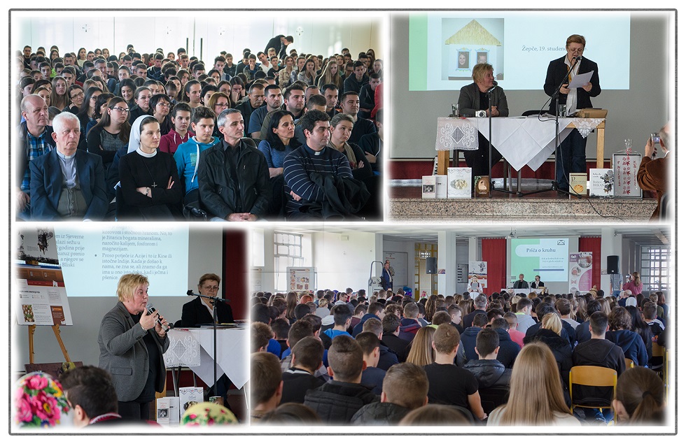 Nama su se predstavile u dva termina. Prvi je bio u 11,30 za učenike i djelatnike Centra, a drugi u 17,30 za građanstvo. Uz dio izložbe koja se sastojala od tridesetak panoa s motivima sela i žetve, narodnih nošnji i žetvenih običaja, kao i hljebova kruha odabranih na kutinskoj priredbi Dani kruha i zahvalnosti za plodove zemlje, autorica, gospođa Slavica Moslavac, održala je i vrlo živo i zanimljivo predavanje o kruhu, povijesti kruha i žetvenim običajima moslavačkoga kraja. Time je pokazala mnoge dodirne točke svoga i našega kraja i običaja. Zatim je gospođa Božica Brkan ukratko predstavila svoju knjigu „Oblizeki“. Knjiga je svojevrsno jezično i kulturno blago, sadrži zavičajne recepte izuzetne kulturno-povijesne i etnografske vrijednosti. Iako je naslov knjige većini bio nerazumljiv, brzo je ipak prihvaćen i danima u školskim prostorijama ponavljan. Program je završio izvedbom žetvenoga moslavačkoga kola Žela sam žito i pšenicu koje je s nekolicinom naših učenika, prigodno odjevenih u narodnu nošnju žepačkoga kraja, pripremila i izvela gospođa Moslavac. Učenici su nastavili druženje za stolom koji su sami prostrli. Naše su gošće spremno prihvatile napraviti reprizu programa i u poslijepodnevnim satima za građanstvo iako je pred njima bio dalek put. Da, nikakva fizička udaljenost ni vremenski uvjeti nisu ih pokolebali prihvatiti poziv i doći među nas kako bi u nama barem djelomice probudile možda već tvrdo zaspalu ljubav prema korijenima iz kojih smo jednom niknuli. Na tome im zahvaljujemo.